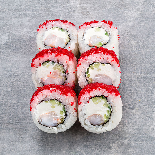 Маки Эбики с креветкой, сливочным сыром, огурцом и икрой тобико