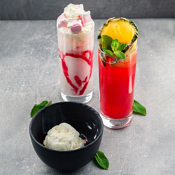 Яркие напитки: персиково-клубничный молочный коктейль, лимонад с ананасом.