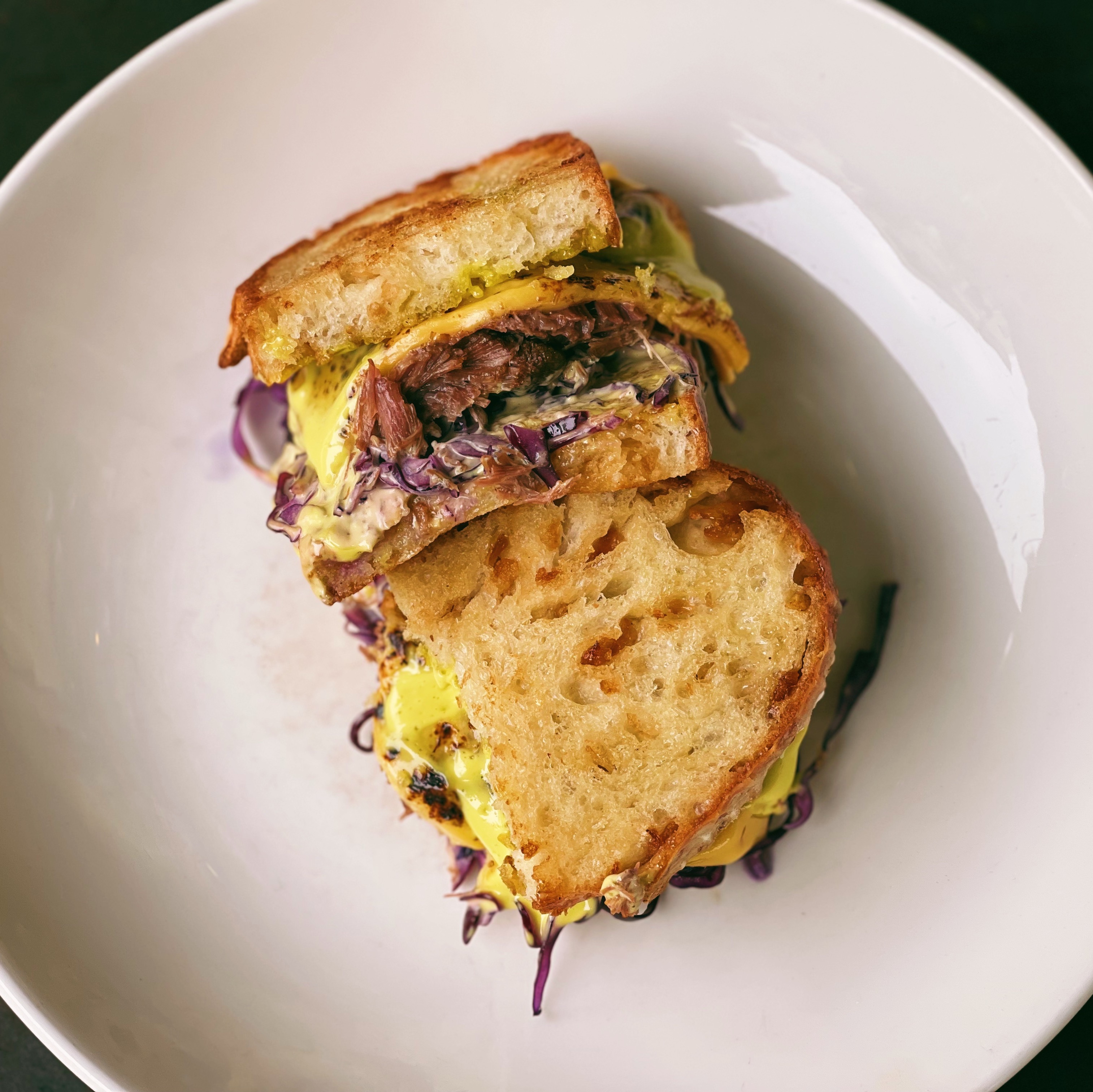 - сэндвич с томлёной говядиной, маринованной капустой и базиликовым майо